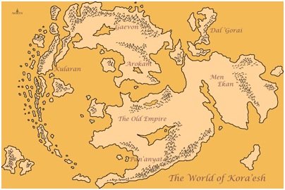 Kora’esh, was in der Sprache des Waldvolkes „Exil“ bedeutet, ist eine runde Welt wie die Erde, Flora und Fauna sind im Großen und Ganzen ebenfalls ähnlich. Der größte Unterschied, der einem recht bald ins Auge sticht, ist, dass es sich bei ihr nicht um einen Planeten sondern um einen Mond handelt, der zusammen mit zwei anderen Monden (She’tain und Kyi’an) einen größeren Planeten (Althas oder AlThai genannt) umkreist.